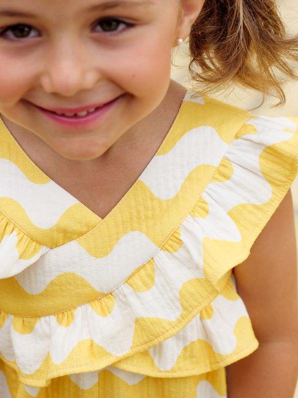 ¡No dejes pasar la oportunidad de que tu pequeña luzca increíble y disfrute del verano con este mono corto tan especial! Con ondas, volantes y mucha personalidad, ¡es el outfit perfecto para cualquier ocasión!