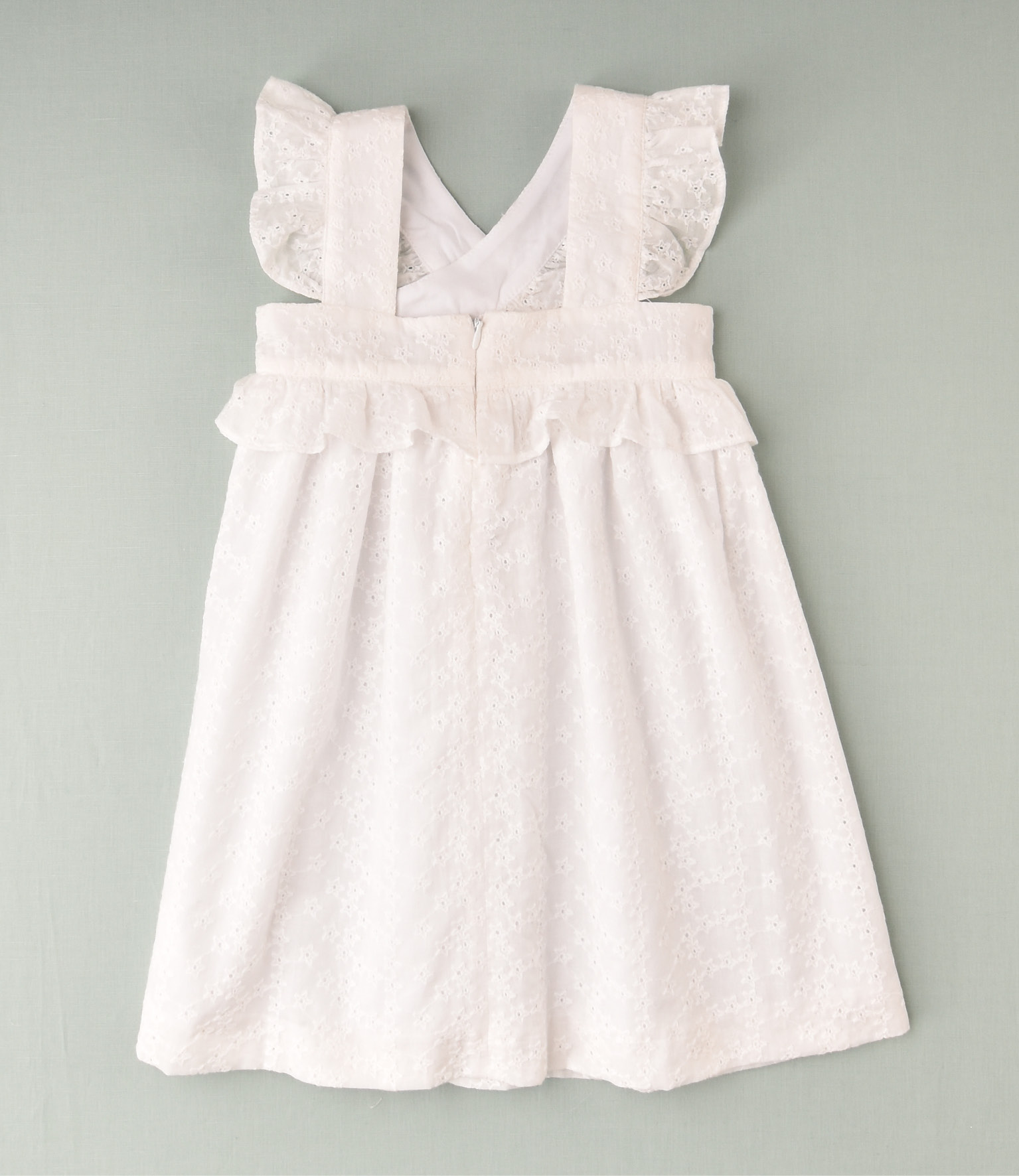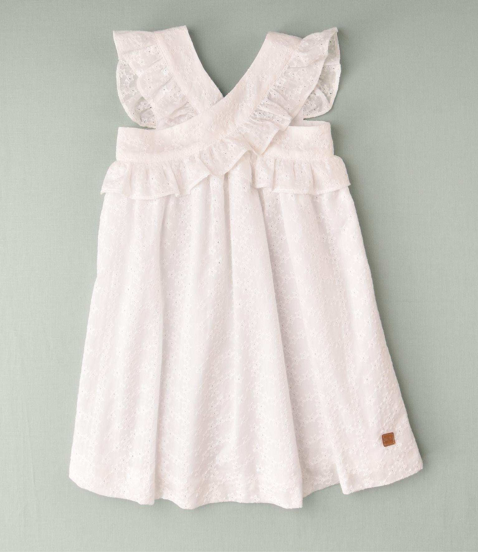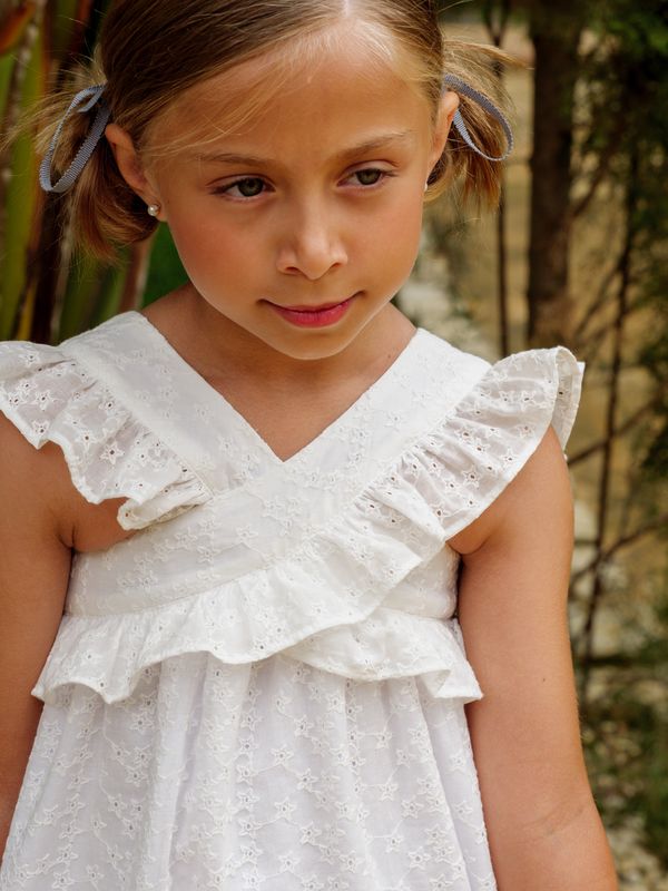 Este hermoso vestido bordado en blanco es el complemento perfecto para las ocasiones más especiales. Con un delicado bordado que adorna todo el vestido, aporta un toque de elegancia única, mientras que el escote cruzado le da una aire sofisticado y moderno. Es un vestido que hará que tu pequeña brille con dulzura y estilo, ya sea para una boda, una fiesta o una celebración familiar.