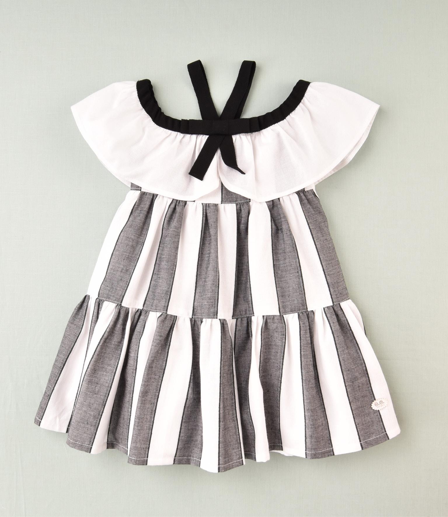 Si buscas un diseño único y lleno de estilo, este vestido de rayas con hombros descubiertos es la elección perfecta para que tu niña deslumbre en cualquier ocasión especial. Su corte sofisticado y su aire moderno lo convierten en una prenda imprescindible en su armario.